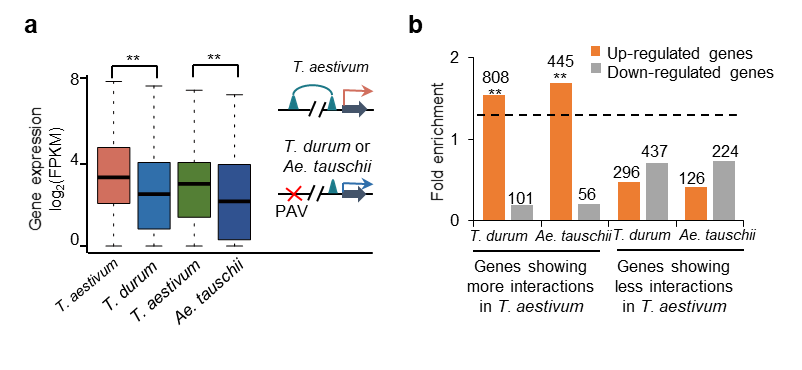 普通小麦大部分基因有三个拷贝,该研究发现小麦亚基因组同源基因之间存在广泛的染色质互作偏向,而这些偏向并不是由染色质可及性差异导致的,其中一部分可能是由于亚基因组之间的结构变异引起的。通过比较不同倍性的小麦基因组,鉴定了多个在普通小麦中存在而四倍体和二倍体小麦中不存在的大片段染色质变异(PAVs),与之相对应的,与这些位点形成染色质互作的基因在普通小麦中的表达水平更高(图2)。