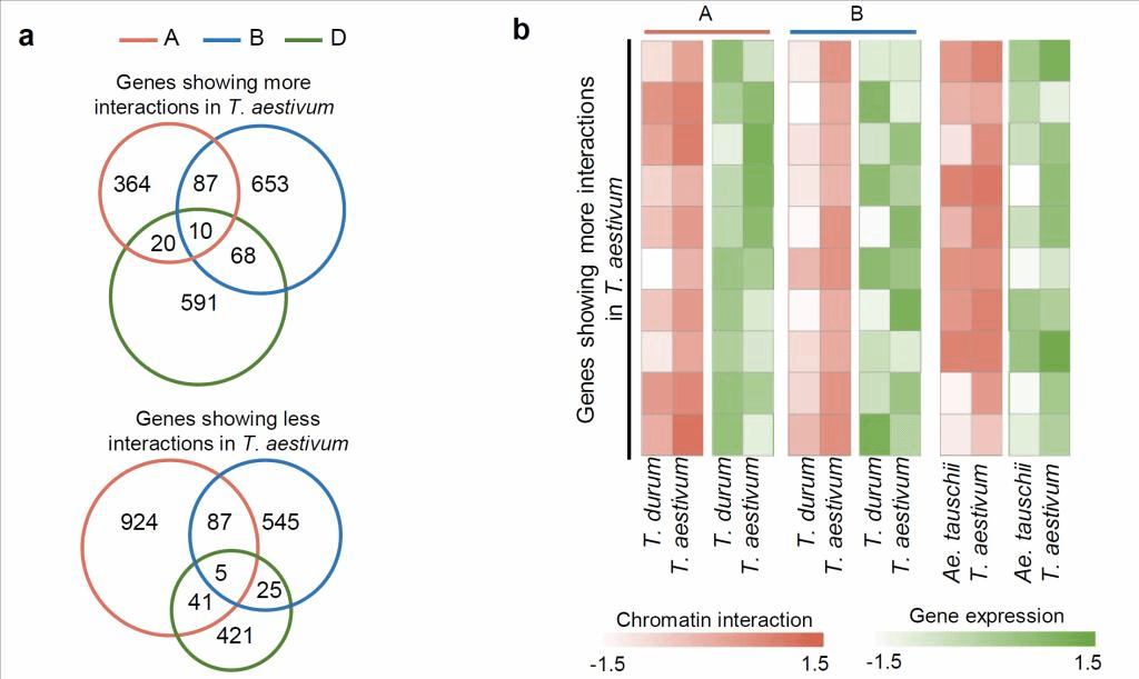 该研究进一步鉴定了在不同倍性小麦中存在开放染色质互作差异的基因,这些基因在不同亚基因组中参与不同的生物学过程,例如在AB亚基因组的基因主要富集非生物胁迫和信号传递相关基因,而在D亚基因组的基因主要富集胚胎发育和翻译相关基因。尽管大部分多倍化产生的染色质互作差异只发生在单个基因拷贝上,但该研究仍然发现了15组A、B、D同源基因在小麦多倍化中同时发生了染色质互作变异,而且一半以上的基因的表达变化和染色质互作变化正相关(图3)。