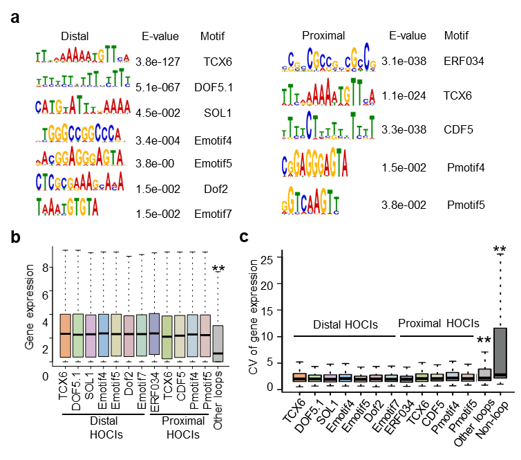 该研究通过不依赖抗体和低成本的OCEAN-C技术高分辨率地绘制了二倍体、四倍体和六倍体小麦全基因组开放染色质互作图谱。与其他基因组区域相比,开放染色质互作环的锚点显著富集组蛋白修饰并且具有更高的染色质可及性,开放染色质互作强度越高的基因其表达水平也越高。有意思的是, 67%的染色质互作锚点可以与5个以上位点产生互作,被称为开放染色质互作热点(HOCIs)。这些互作热点显著富集多种转录因子结合元件,其关联基因表达更高,并且可能促进了关联的多个基因的协同表达(图1)。