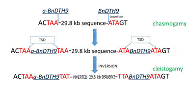 该研究首先通过基因定位,将控制闭花行为的孟德尔遗传因子定位在油菜C03染色体的85.4 kb区间内;然后,利用图位克隆方法,发现定位区间内存在一个29.8 kb染色体倒位;大群体试验中,倒位性状的分子标记与闭花性状遗传契合。研究发现,该倒位由微型反向重复转座子(Miniature Inverted repeat transposable elements,MITE)MITE BnDTH9介导。