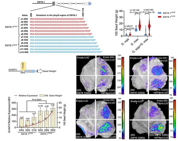 盖钧镒院士团队前期率先构建了1套野生大豆染色体片段代换系群体,定位了大豆百粒重、油脂含量等驯化相关性状的遗传位点。本研究针对控制大豆百粒重的主效位点qSW16.1,通过精细定位克隆到该QTL内的SW16.1基因,在大豆种质资源中鉴定到12种SW16.1等位基因。转录组、酵母单杂、启动子-荧光素酶等分析表明,SW16.1序列变异(ployQ中Q数目不同)可调控大豆籽粒中MT4的表达量,从而影响百粒重。此外,研究分析了大豆种质资源群体中SW16.1和其它已知粒重基因的自然变异,发现栽培大豆丢失了38.5%的野生大豆等位基因,并且丢失的等位基因多数对百粒重是负效的。负效等位基因的丢失导致栽培大豆中正效等位基因的频率变高,伴随着遗传背景的改变,促成野生大豆驯化为栽培大豆后百粒重增加。该研究结果为解析大豆优异种质资源的形成与演化提供了新的见解,为大豆设计育种提供理论依据。