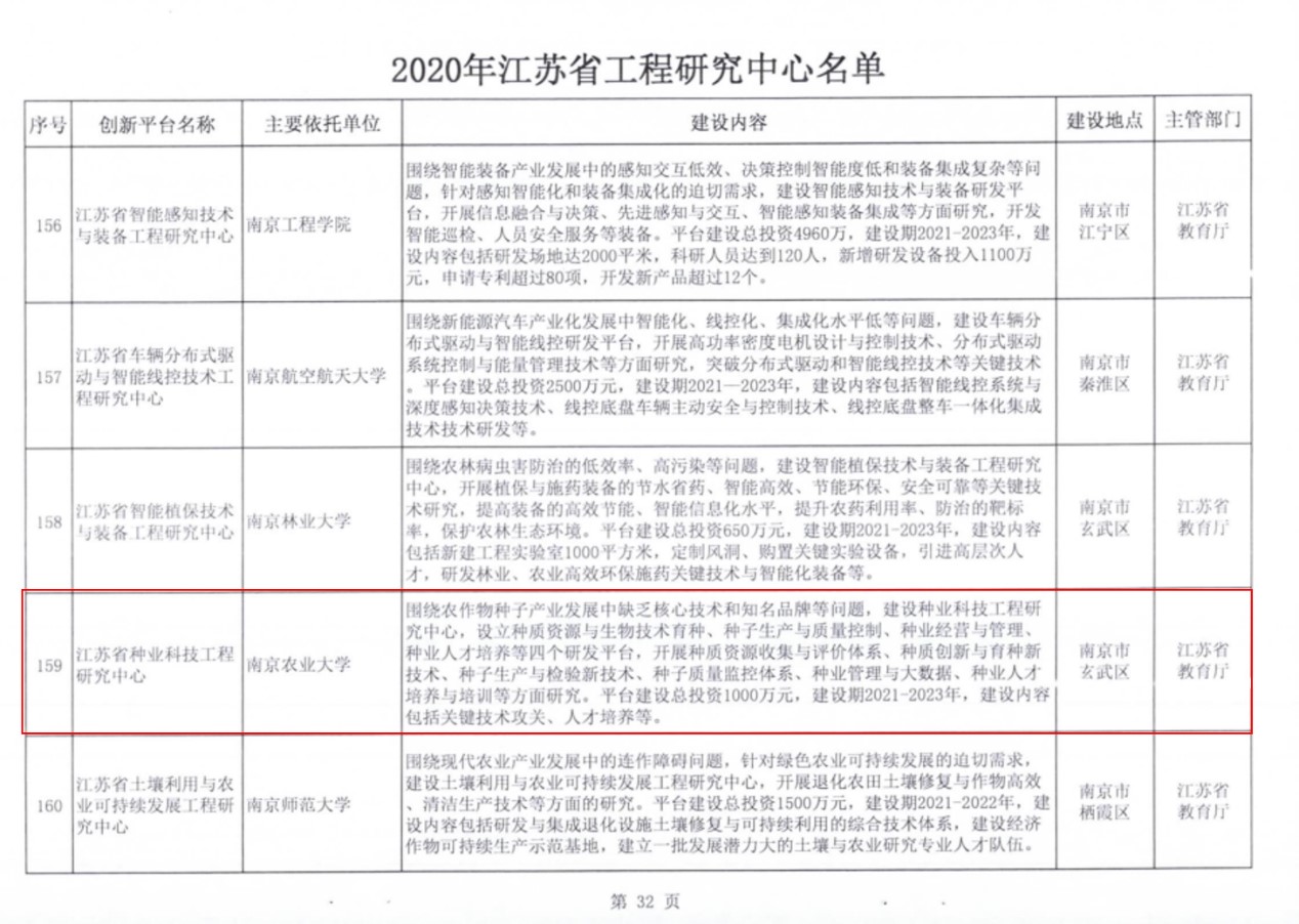 近日,江苏省发展和改革委员会公布了建设2020年江苏省工程研究中心的通知(苏发改高技发〔2020〕1460号),经学校推荐、第三方材料审核、专家评审、结果公示等程序,我院申报的“江苏省种业科技工程研究中心”获江苏省发改委批复立项建设。