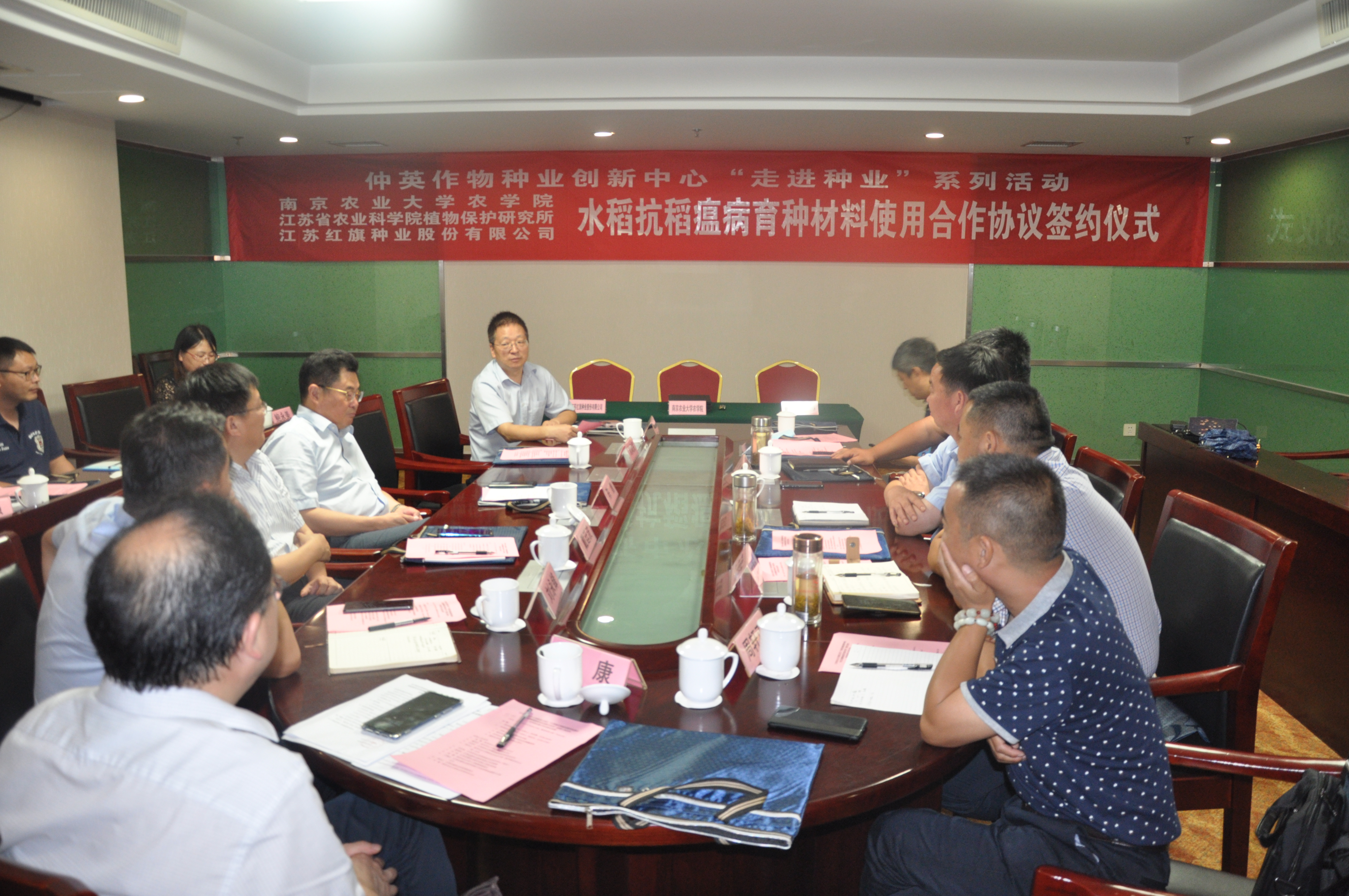 7月24日下午,江苏省农业自主创新重点项目“江淮稻区稻瘟病菌群体遗传分析及抗穗颈瘟基因的发掘与利用”进展汇报会和合作协议签订仪式在我校举行。51吃瓜网 社会合作处处长陈巍,51吃瓜网 党委书记戴廷波,江苏省农业科学院植物保护研究所所长刘凤权,江苏省农业科学院宿迁农科所所长刘永锋,江苏红旗种业股份有限公司总经理查联群、副总经理华荣,51吃瓜网 种业科学系系主任刘康,51吃瓜网 仲英作物种业创新中心主任鲍永美和张红生教授、黄骥教授等参加会议。
