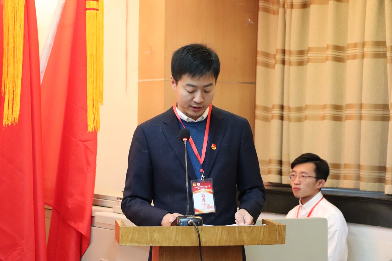 在庄严的国歌声中,本次代表大会拉开序幕。校团委书记谭智贇代表校团委在开幕式上发表讲话。他指出,团代会的召开是各级团学组织和广大青年学生政治生活中的一件大事。大会的召开,对于进一步团结动员团员青年积极投身于学院建设,开创学院团学工作新局面具有重要意义。他充分肯定了近年来我院团学工作取得的成绩,同时对今后的团学工作提出希望和要求。他强调,一是突出思想引领,坚定信仰,挺起时代担当。要学习贯彻习近平总书记系列重要讲话精神,创新工作模式,打造好阵地,深化实施“青马工程”;二是注重成长成才,奋发有为,助力青年发展。服务内容上抓深度,服务对象上抓覆盖度;三是强化自身建设,强基固本,凝聚青年力量。团组织要做到知青年,懂青年。