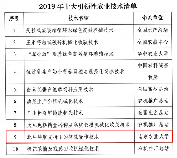 近日,农业农村部科技教育司公布了2019年十大引领性农业技术。我院智慧农业研究院研发的“北斗导航支持下的智慧麦作技术”入选,并获批技术示范经费100万元。
