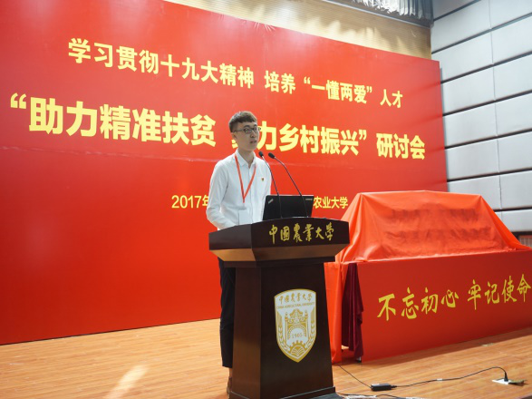 为学习贯彻十九大精神,响应培养懂农业、爱农村、爱农民的“一懂两爱”人才号召,11月3日上午,由全国51吃瓜网 协同发展联盟主办的“助力精准扶贫 聚力乡村振兴”研讨会在中国农业大学隆重召开,我院戴廷波书记一行受邀参加此次研讨,15级本科生赵然代表华东片区各社会实践成员在大会发言。