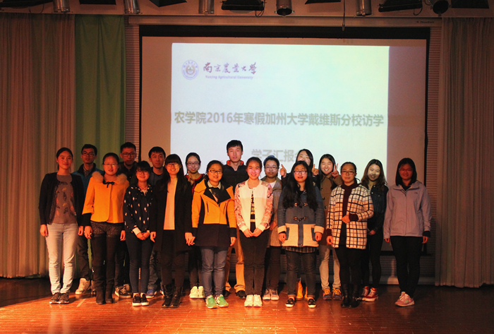 主持人简要介绍了2016年加州大学戴维斯分校寒假短期交流访学项目:加州大学戴维斯分校是我校的重点合作伙伴,在QS2015年农林学科世界大学排名中位列第一。多年来,加州大学戴维斯分校一直以她优质的教育水平,美丽的校园景观,友好的校园氛围以及加州独具优势的气候吸引着世界各地的学生,而且作为我校重点合作伙伴,一批又一批的南农学子经过选拔去到UC davis 学习体验。本次汇报会,17名参加了访学交流的同学分为四组,以不同的主题介绍了此次访学的体验及感悟。第一组由虞达浪,吕澜,席浩淳,荀倩,谢倩雯组成,以“Gains From UCD”为主题,主要介绍了在加州大学戴维斯分校访学期间了解和参观到的实验室概况、植物园农场。特别的文化交流方式:host family,以及中西方课堂的不同。大家也对同学们所提问的关于如何准备参与这一项目进行了详细的讲解。第二组成员包括李梦雅、苏炜宣、何清、汤琳芮,他们以“Get Out Alive In Davis”为主题,从学习生活等方面介绍了自己在UCD最深刻的体会,告诉大家要友好,惜时,信任,向上。第三组以”Empowering Us All”为主题,成员包括邹舟、陆宇阳、汪露瑶、靳雪莹。他们主要介绍了UCD的概况,以及自己在这段访学经历中的改变,也结合自身给与同学们关于学习的建议。第四组学子包括王金格,杨灿,沈吉珉,李聪敏,以“Our Impression On UCD”为主题,主要介绍了美国的人文美景,UCD的环境设施和学术氛围。