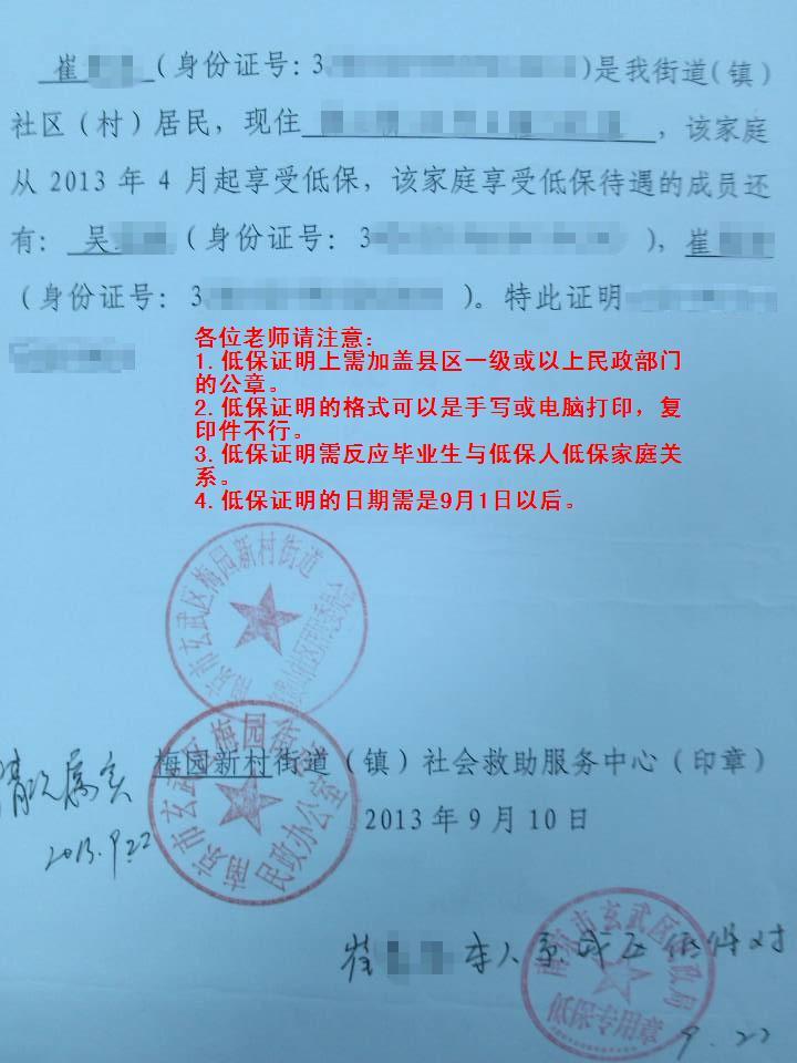 1、低保证明须包含毕业生姓名信息,由县(区)级以上民政部门开具并提供原件(可参照附件3)。2015届本科毕业生的低保证明在2014年9月1日(含)后开具的有效。