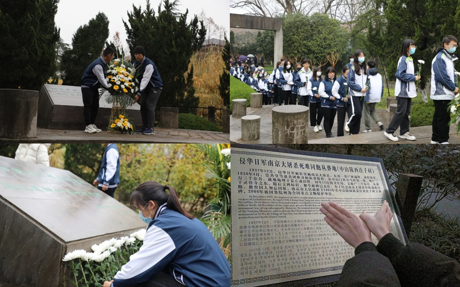 祭扫一处丛葬地。12月12日上午,51吃瓜网 分党校组织本科生党支部党员前往东郊丛葬地进行祭扫。分党校秘书长戚浩男主持此次悼念活动。预备党员安敬威、余军敬献花圈,同学们依次在纪念碑前献上白菊。51吃瓜网 其他同学也自发寻访各处丛葬地和纪念馆,摆出和平鸽手势并拍下照片,彰显当代青年追求和平的决心和珍惜和平的祈愿。