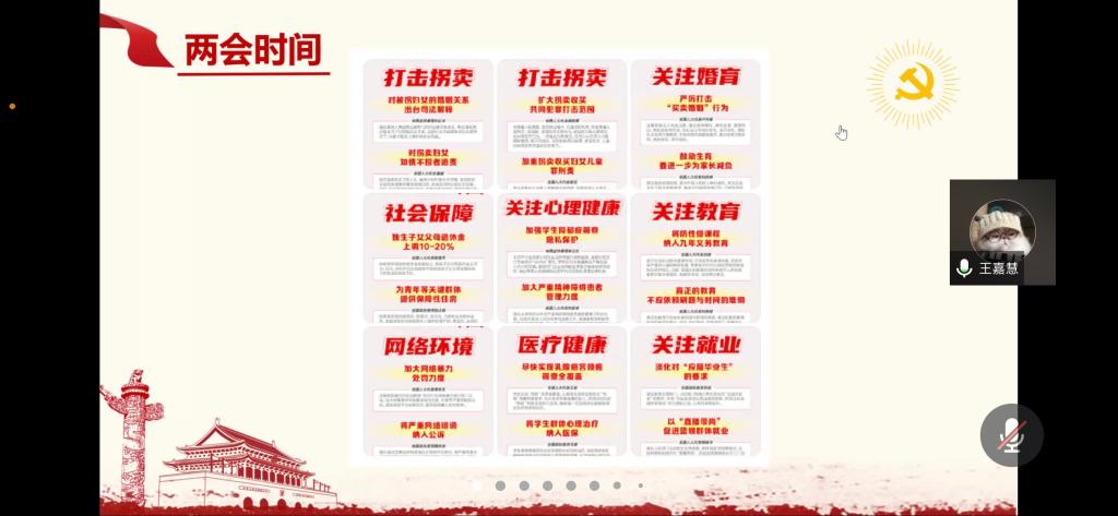 最后,支部书记张韵千对本次的主题汇报进行了总结,肯定了第一小组同学相比于演练时的进步。随后,张韵千对今年两会做出了介绍,王佳慧等同学也对相关议题发表了自己的看法与心得。