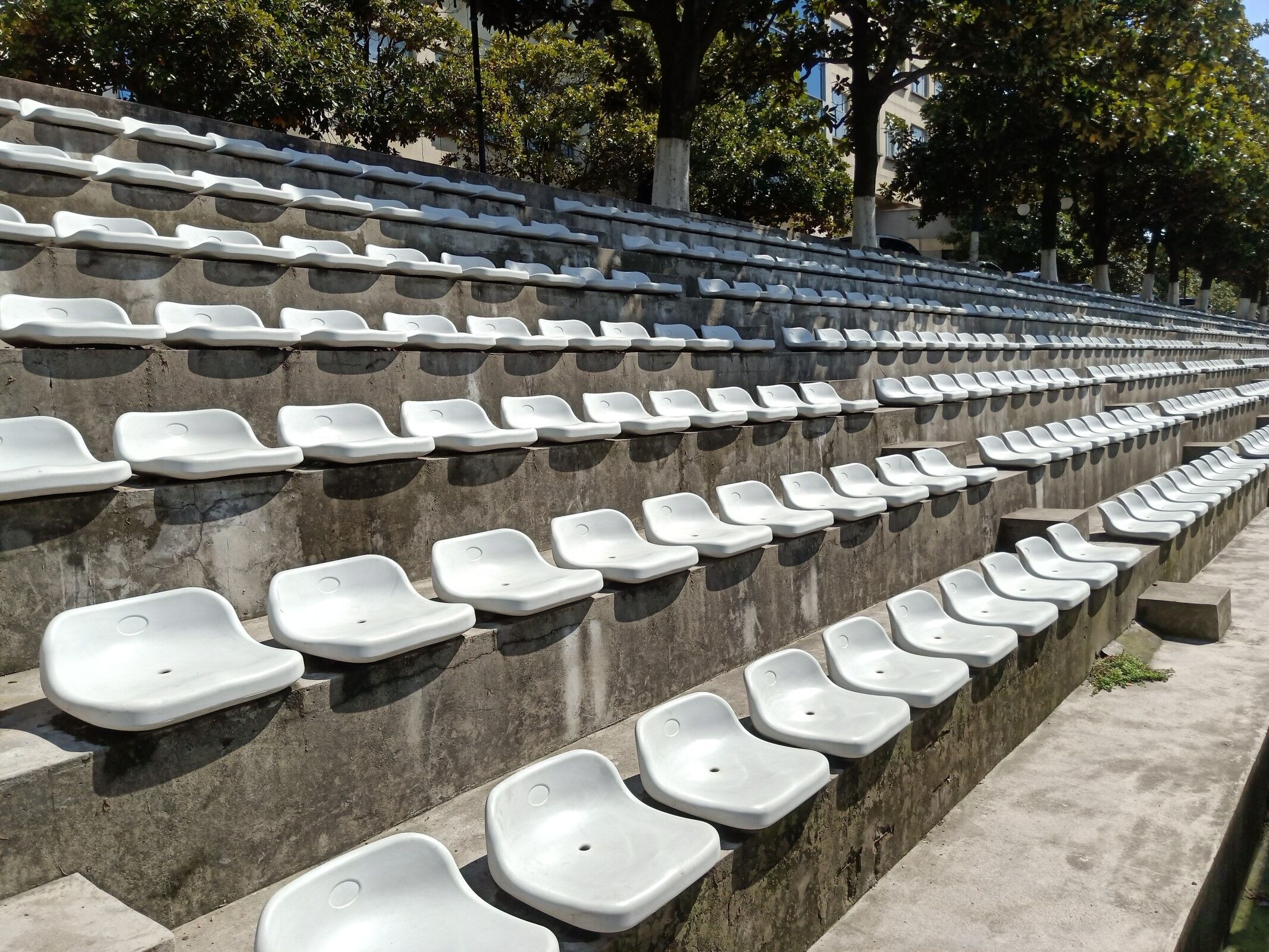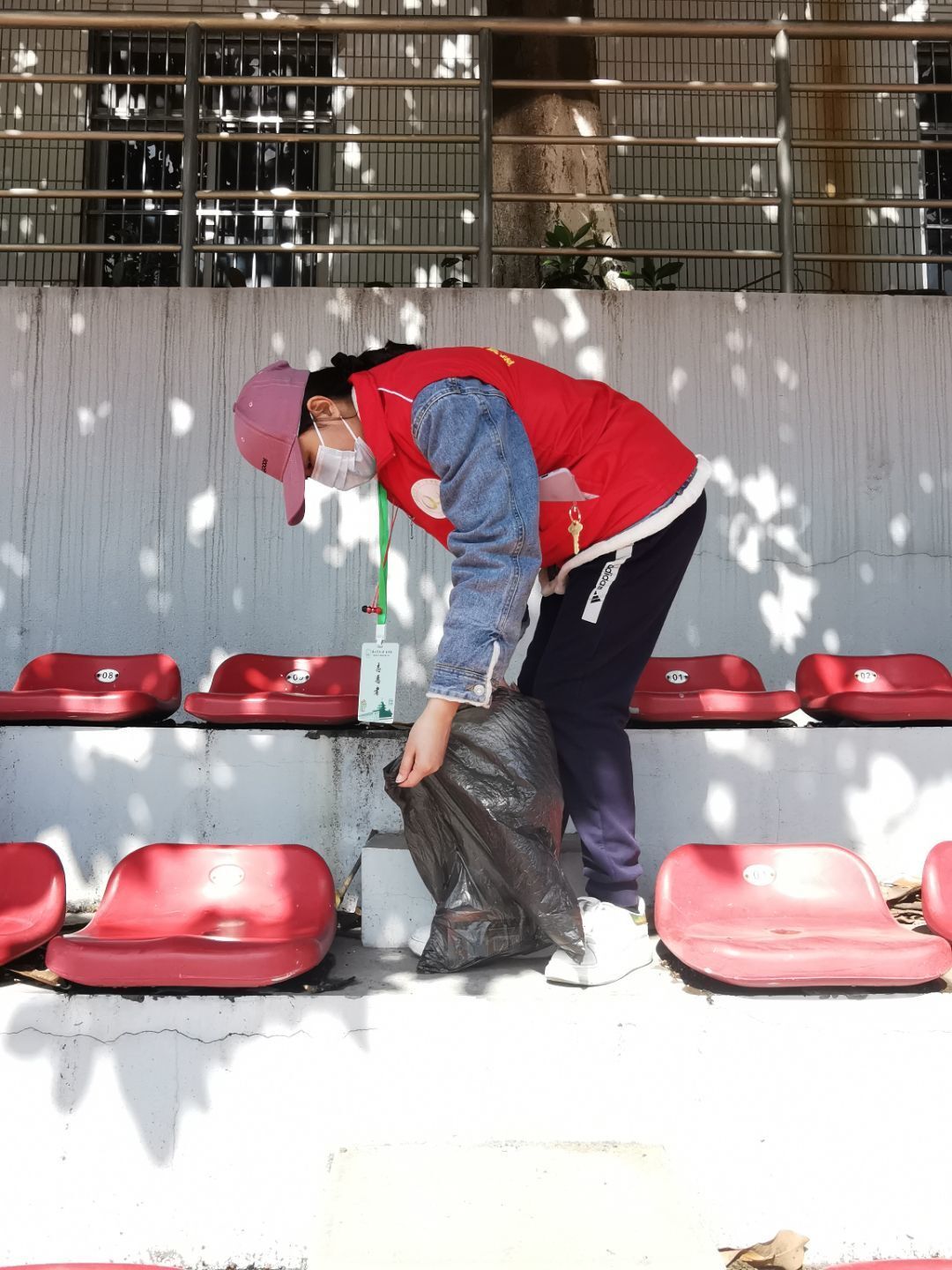 经过一个小时的辛勤劳动,志愿者们将主席台右侧以及靠近玉兰路一侧的所有观众席位,全部打扫干净。落叶不在,椅子一尘不染,整个观众席在阳光的照耀下洁净如新。