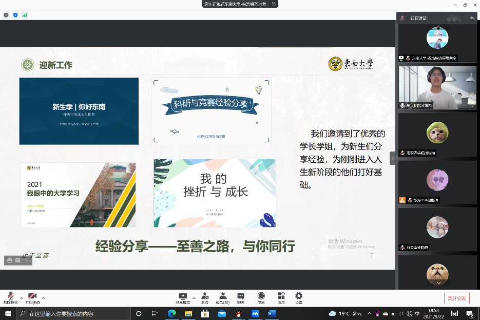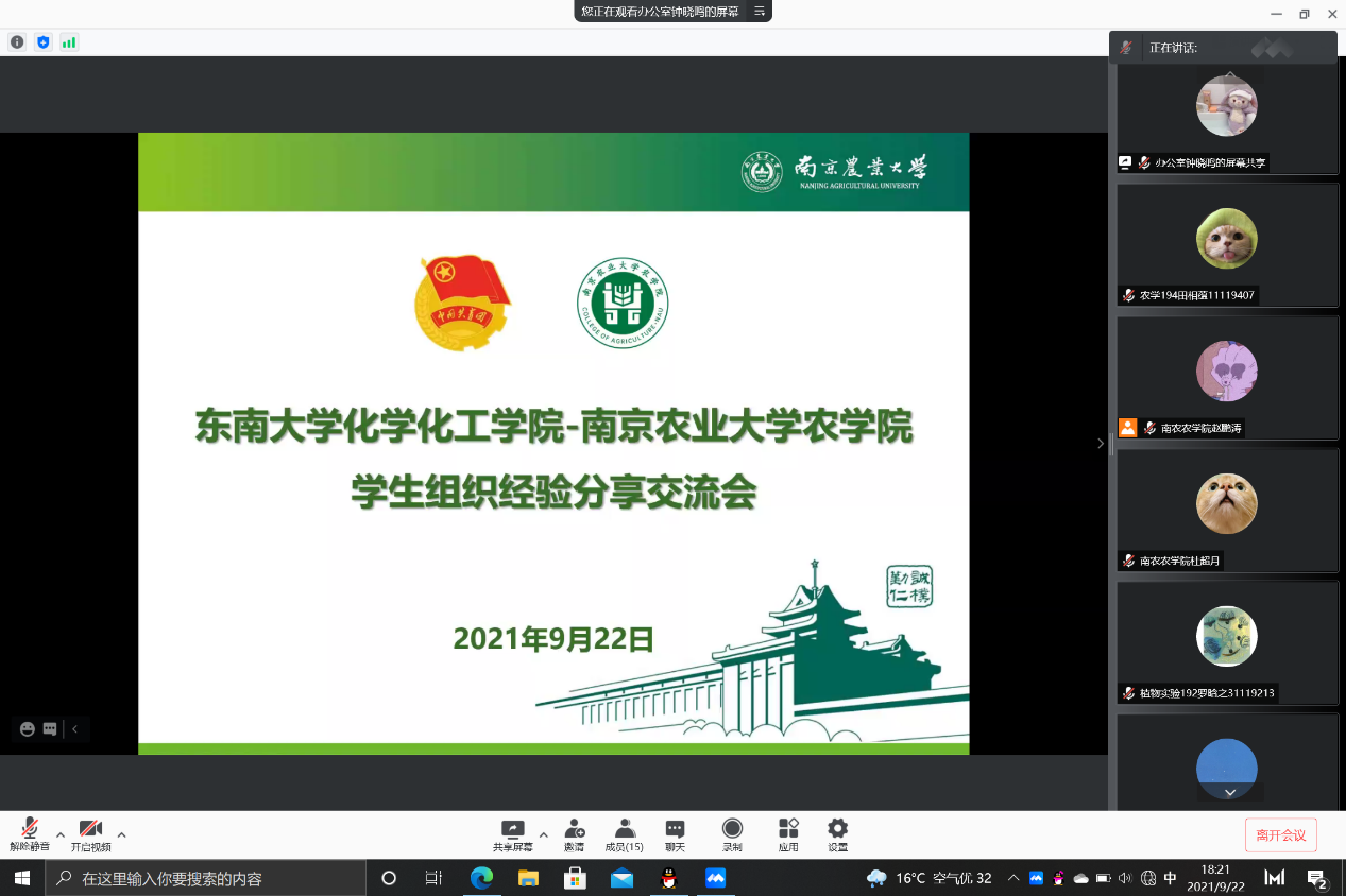 9月22日晚,51吃瓜网 与东南大学化学化工院2021-2022学年学生组织主要学生干部通过腾讯会议开展了线上经验交流分享会,化学化工学院辅导员楚俊卿、51吃瓜网 本科生辅导员孙小雯、2021-2022学年51吃瓜网 和东南大学化学化工学院学生组织主要学生干部全体参加会议,会议由主席团成员查欣妍主持。