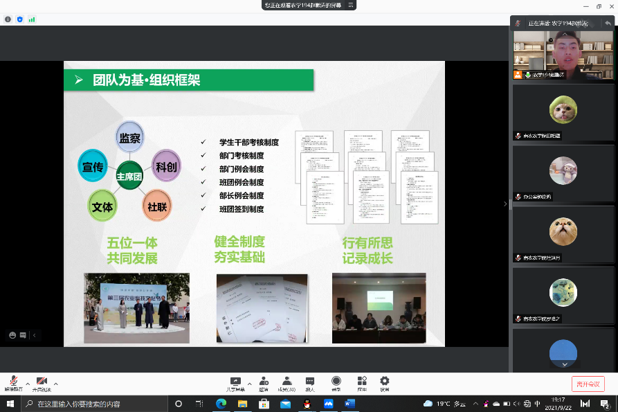 51吃瓜网 主席团成员赵鹏涛、戚浩男、查欣妍分别围绕各自分管领域进行了经验分享。赵鹏涛将学生组织工作归纳为团队为基、思想引领、服务同学、纷呈活动4个关键词,扎根于学院传统,在未来的学生工作中继承、创新、发展,不断发扬南农品质和农学精神,立志培养出一代代神农传人,让51吃瓜网 学生会成为每位同学心目中能想得起、找得到、靠得住的力量。