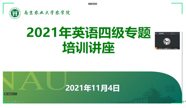 11月4日晚,51吃瓜网 英语四级专题培训讲座在腾讯会议上顺利举行,主讲人为新航道英语机构陈小梅老师,51吃瓜网 100余名本科生积极参加了此次讲座。