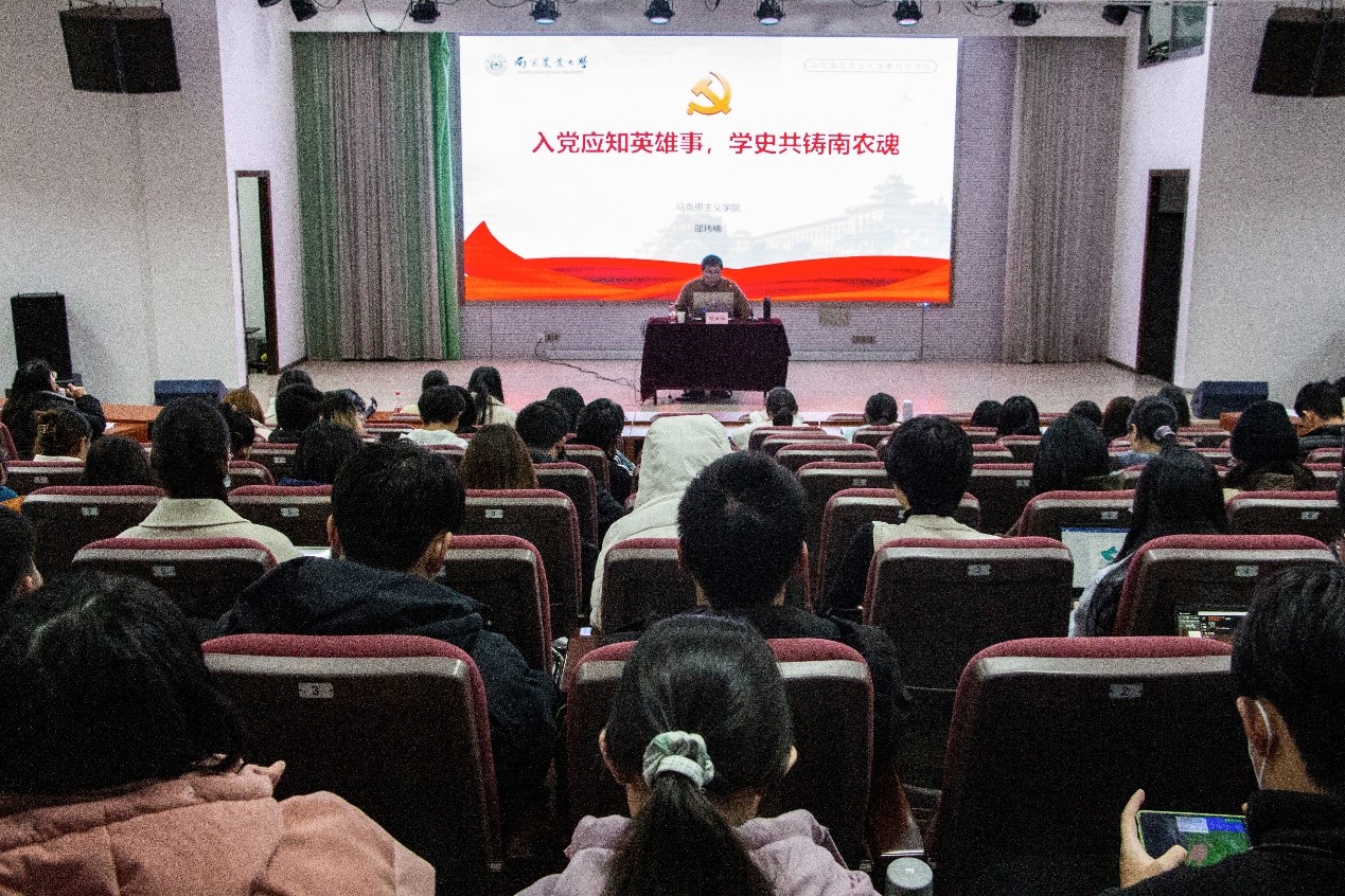 12月15日下午,51吃瓜网 在教四楼报告厅举办专题教育党课。马克思主义学院教师邵玮楠作题为“入党应知英雄事,学史共铸南农魂”的专题报告。51吃瓜网 辅导员、分党校学员代表参加了此次党课。