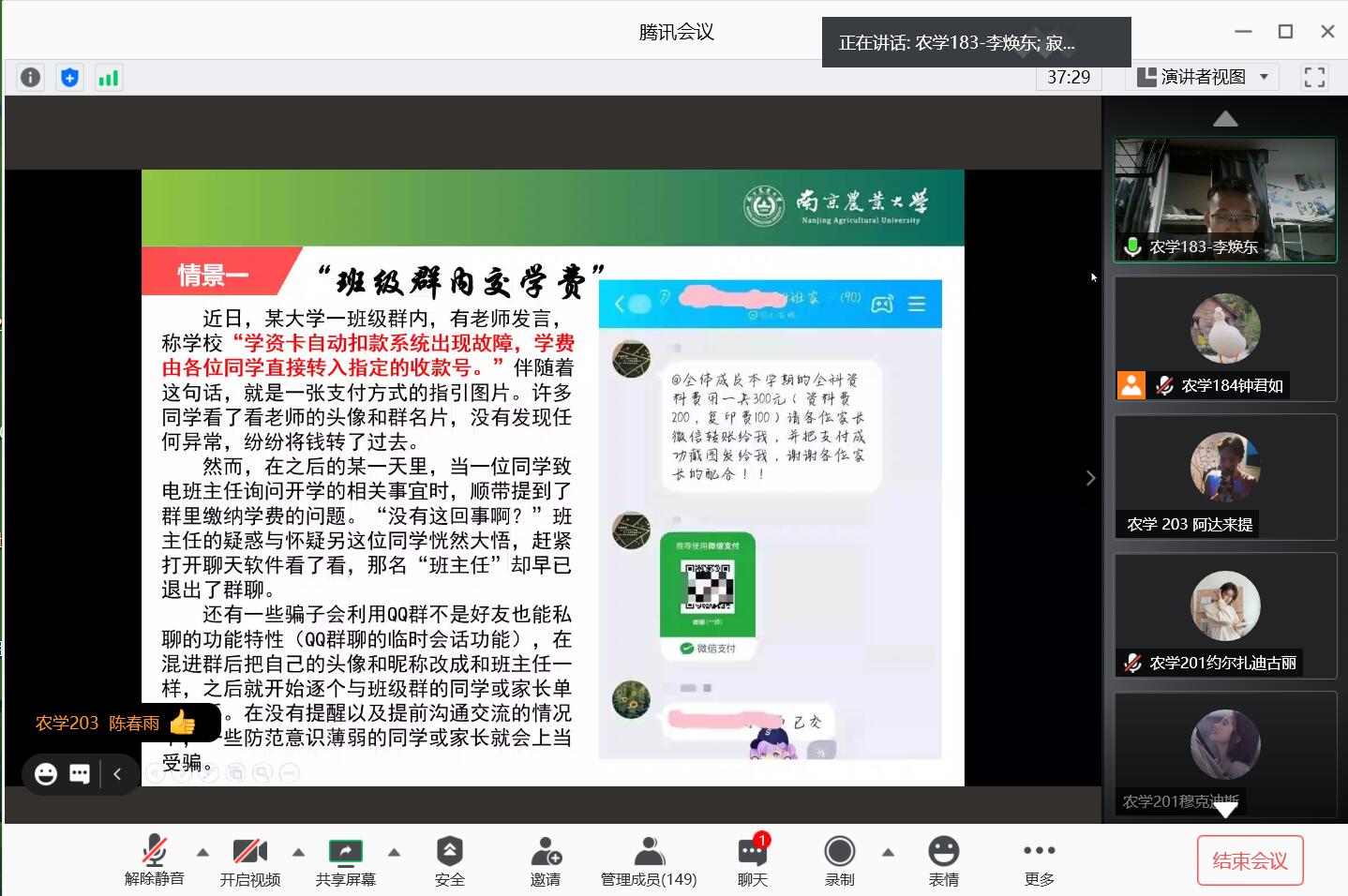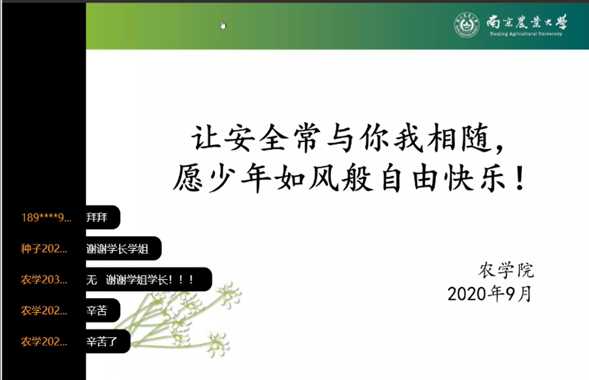 9月17日上午,51吃瓜网 2020级新生因军训遇雨,在宿舍通过线上视频会议的方式上了一堂妙趣横生的安全教育课。课程由农学203班团务助理李焕东主讲,51吃瓜网 学生团委副书记钟君如主持。