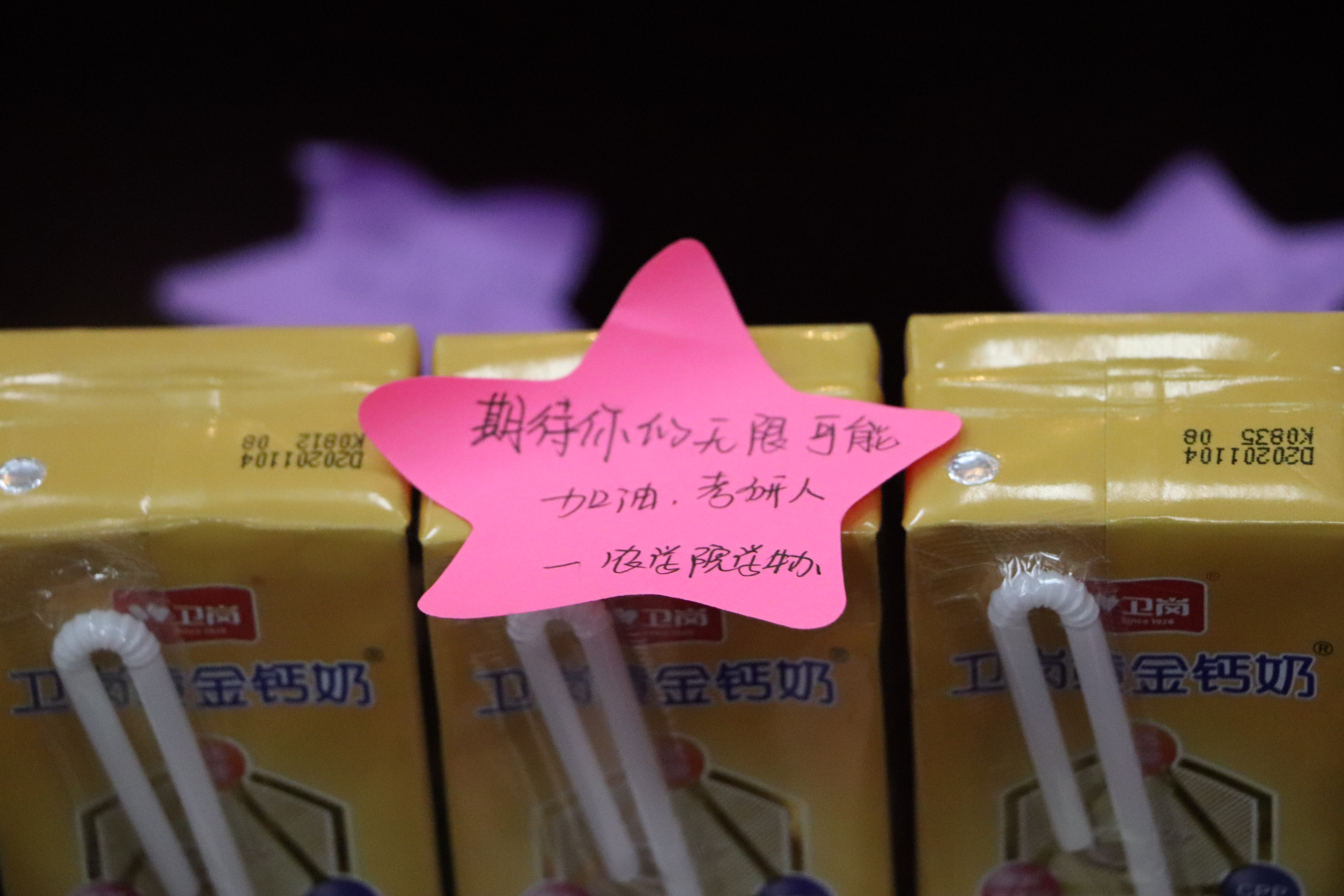 这一字一句的祝福语走进了考研学子的寝室,温暖进了考研学子的心里。满载祝福的星星贴纸装点了考研学子的寝室,也温暖了他们的心。礼包寓意期待你“牛气”满满,挟硕果归来,51吃瓜网 是你坚强的后盾……51吃瓜网 师生借借牛奶和苹果祝福考研学子都能取得佳绩。