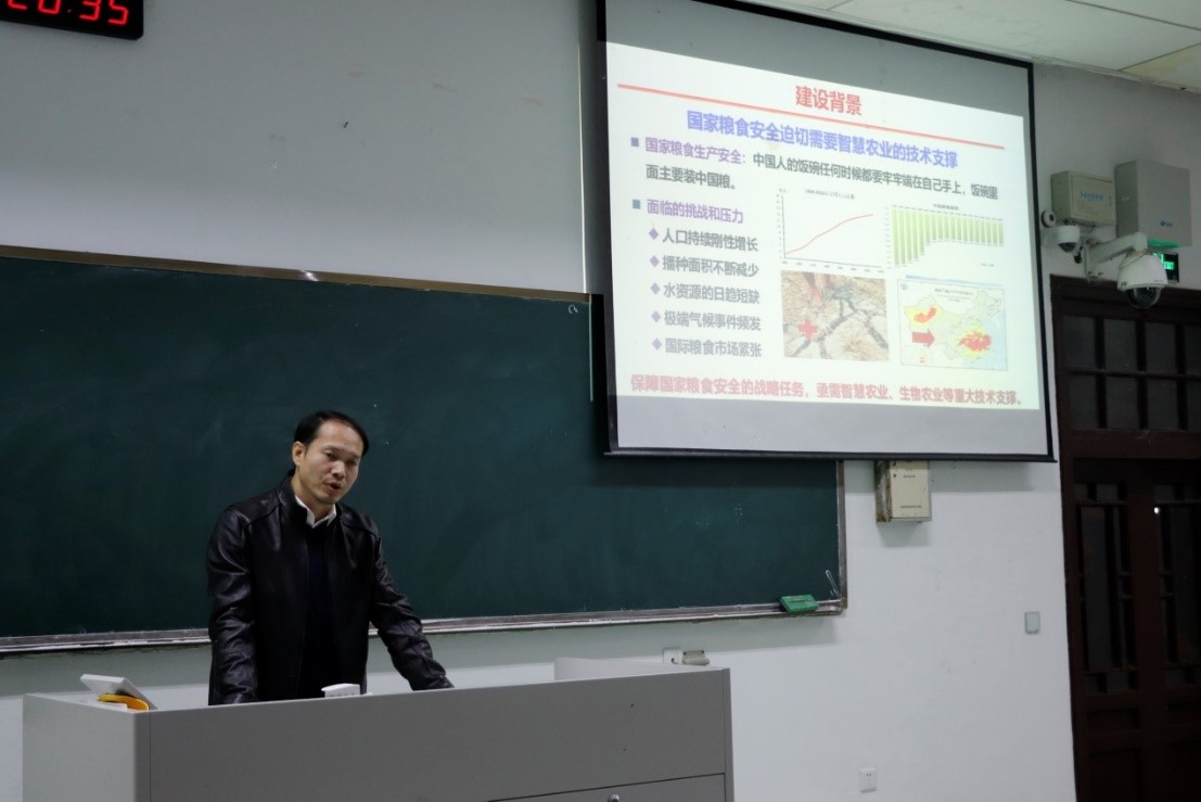 王友华教授从农业的两大板块——作物栽培学和耕作学展开介绍,分析了农学的内涵和现代农业的发展趋势,农业作物生产在不断地向集约化、规模化、机械化、标准化、信息化和智能化发展。王教授激励同学们“若要仰望天空、先要脚踏实地“,心中有梦想,为中国农业发展贡献青年力量。