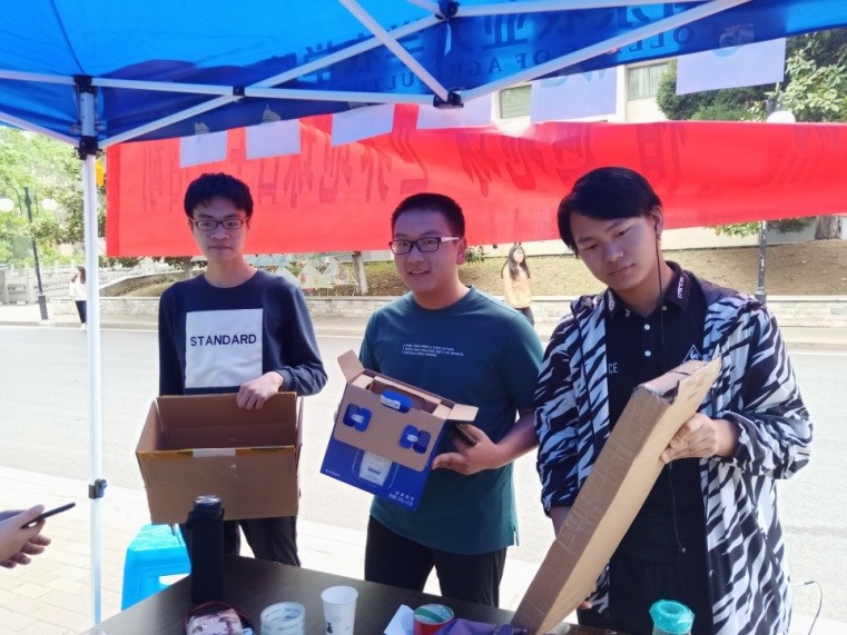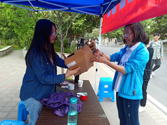 活动前,志愿者在微信上发布本次活动的宣传推送,介绍活动形式:收集身边废旧的纸箱、快递盒、鞋盒等,使这些盒子能够被再次循环利用。活动过程中,志愿者们积极地向前来咨询的同学介绍了本次活动的目的,同时也普及了有关世界地球日的知识:“世界地球日于每年的4月22日,是一个专为世界环境保护而设立的节日。它的目的在于提高人们对现有环境问题的意识,通过绿色低碳生活,改善地球的整体环境。