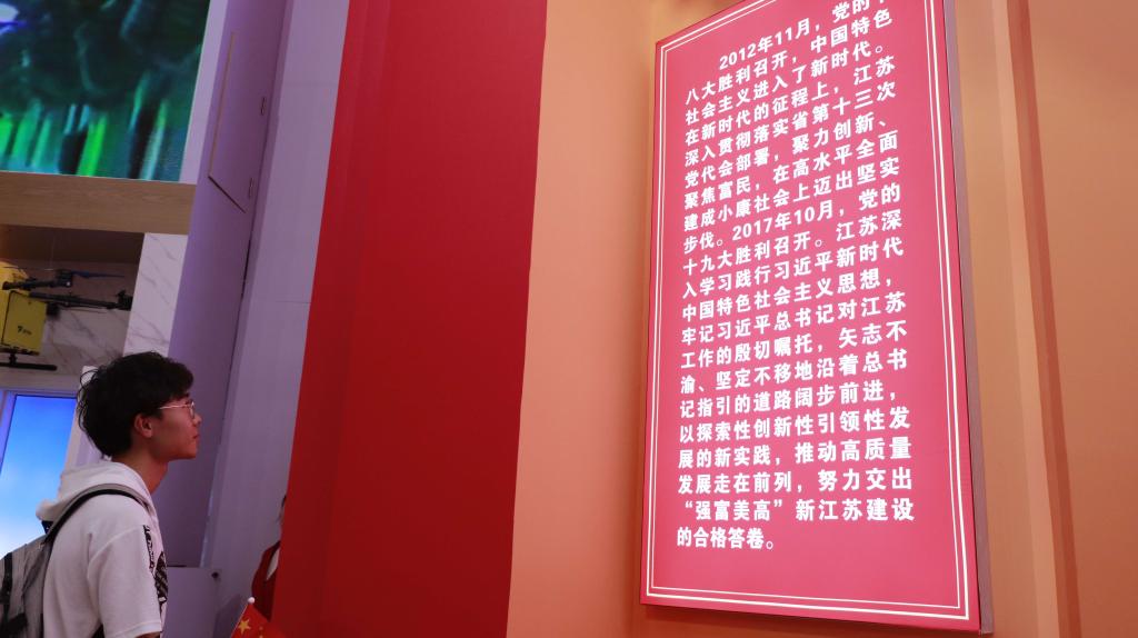 参观伊始,同学们就被门口陈列的模型展示深深吸引,纷纷驻足围观。随后同学们开始进入展厅,学习了解了以江苏为代表的中国伟大历史成就与变革。并纷纷在带给自己触动的地方合影留念不时抒发个人感慨。其中支部党员赵亚南说道:“已经震撼到顾不及周围的声音,自觉降慢步伐,错过任何一处对自己来说都是一个遗憾。”邓天朔同学则感慨道:“在经济发展、改革开放、城乡建设以及奋力开启基本实现现代化新征程中体会江苏发展,感受中国力量,不自觉的想尽快学有所成,加入到建设祖国、发展祖国的行列中。”农学194班钟晓明也兴奋不已,从南京云锦、东海水晶雕刻、如皋盆景、扬州漆器的静态观摩再到苏绣、雕版印刷、宜兴紫砂壶制作、南京雨花茶制作的动态展示,无一不让其感受到江苏的底蕴,中国的文化。其讲道:“我看到的是一个伟大的国家,我们在的是一个伟大的时代,祖国厚重历史文化的传承与现代经济文化的发展,让我无比自豪,小我融入大我,青春告白祖国,在这里我不仅要向祖国母亲告白,我还要向祖国承诺,好好学习,将来做一个对社会有贡献的人。”