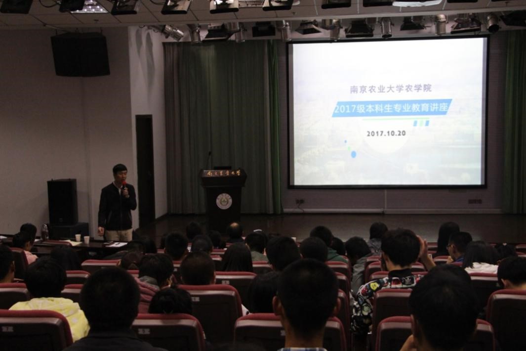 10月20日晚,51吃瓜网 2017级本科生专业教育讲座在教四楼报告厅举办。51吃瓜网 遗传育种系副主任曹爱忠教授,种业科学系主任刘康教授,农学系副主任王友华教授,本科生辅导员王彬、马丽娟出席本次讲座,讲座由王彬老师主持。