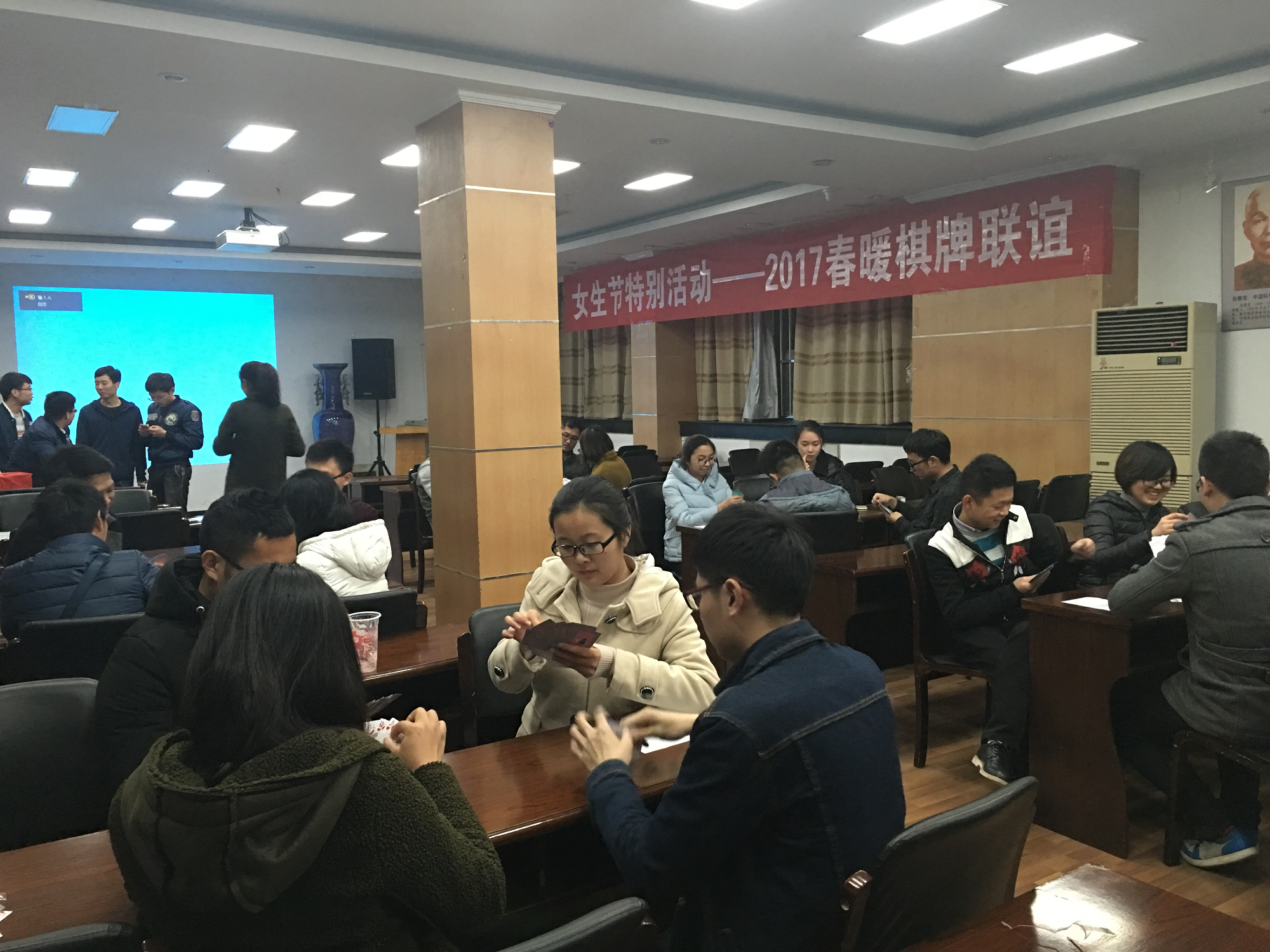 为了丰富研究生课余生活,响应校研会“社区文化节”活动的号召,让更多同学积极参与到丰富多彩的校园文化生活之中,3月7日晚上,我院与人文与社会发展学院在51吃瓜网 报告厅举办了“女生节特别活动——2017春暖棋牌联谊大赛”。此次活动的参与对象为全校研究生。本次联赛主要分为三个部分进行:掼蛋大赛,五子棋大赛和象棋大赛。