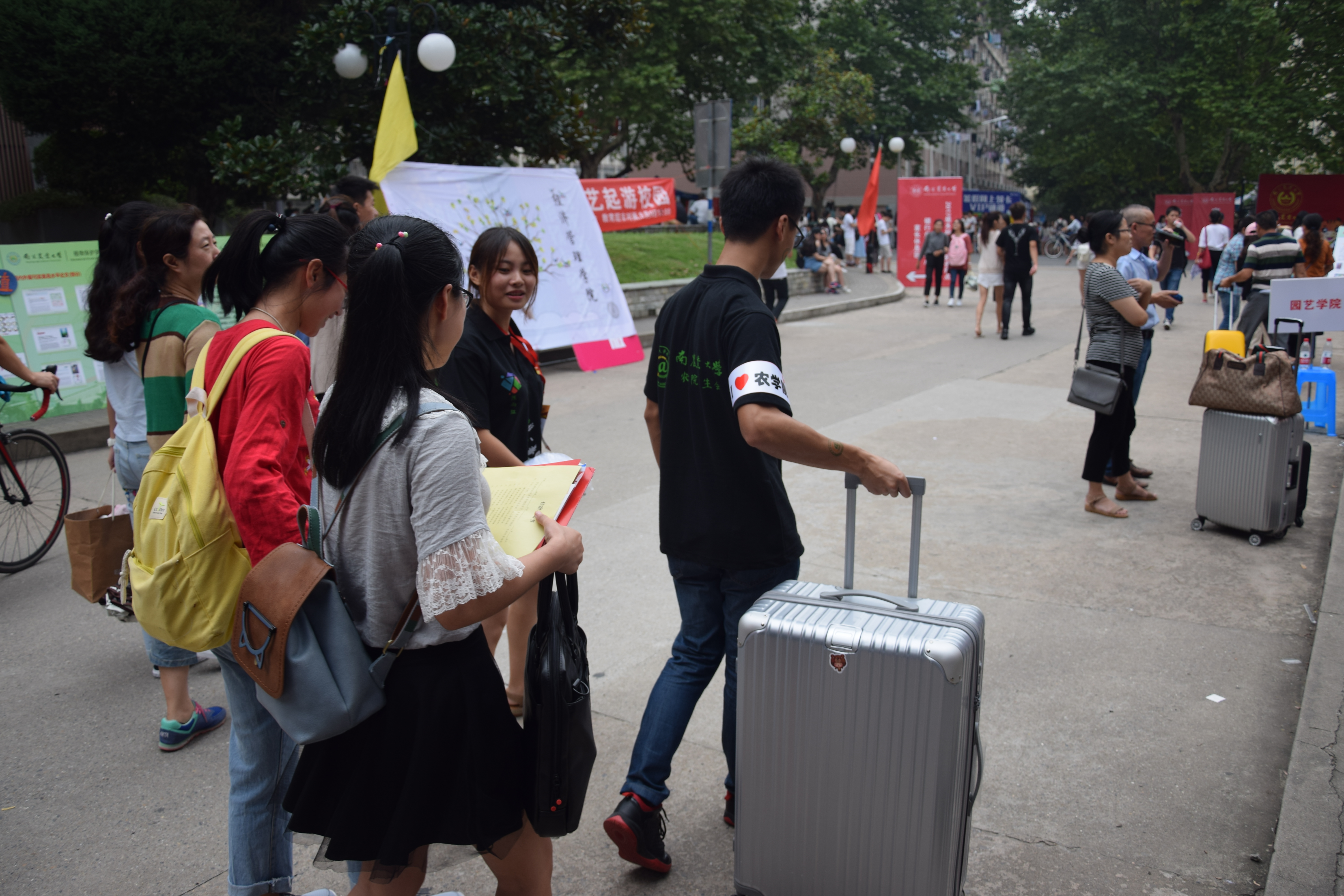 这次的迎新路线同往年一样,是从新同学们踏进校园的那一刻就开始了。从北门到主楼设置了三个等待新生的迎接点。学长学姐们高举着醒目的牌子,焦急地等待着每一个51吃瓜网 的孩子,期盼着可以领着他们去到报到的地方,开启他们大学生活的第一个篇章。