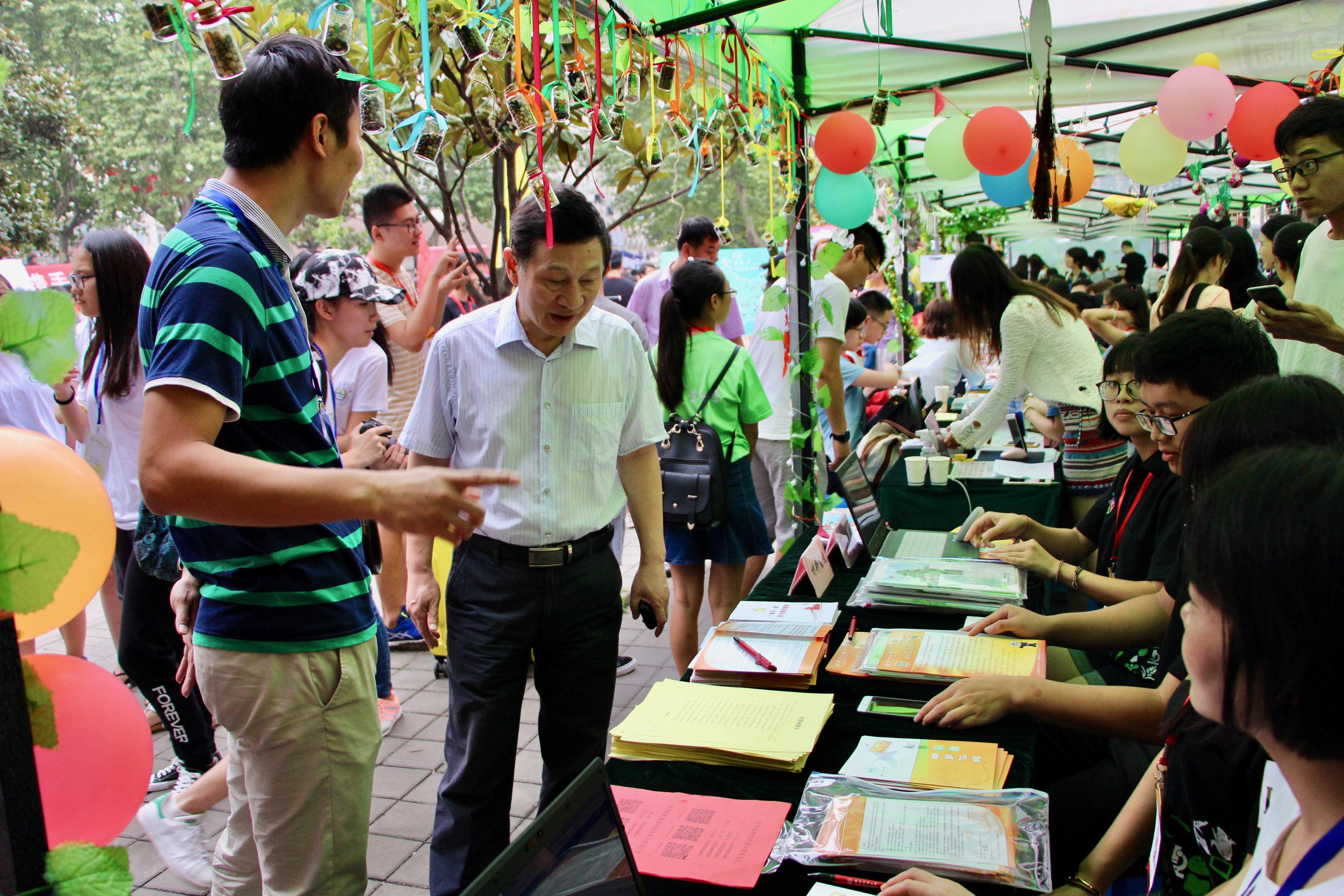 报到是新生进校的第一站。负责在迎新帐篷里工作的学长学姐们很早就把帐篷布置得十分温馨。横梁上悬挂的有代表种子专业的各色种子,也有与今年迎新主题十分契合的星星,寓意是“每一个你们都是南农的一颗新星”。当迎新工作开展得如火如荼的时候,我们意外地迎来了校领导的慰问。辅导员王彬老师向领导详细介绍了迎新工作的进展,我们的努力受到了领导的赞许和肯定。