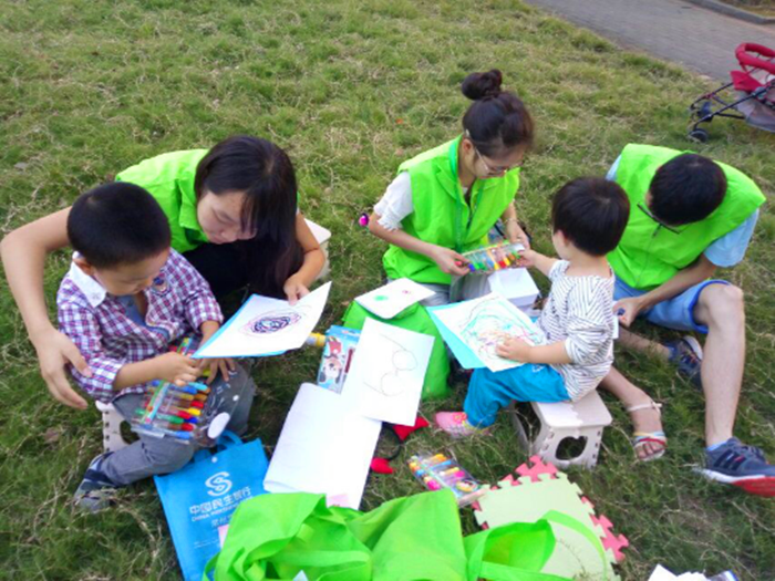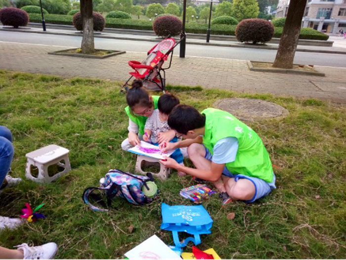 活动正式开始后,志愿者们身着绿色衣服,与小朋友们一起玩游戏,做益智项目。同时志愿者们准备了卡纸剪刀等,与小朋友一起做手工。