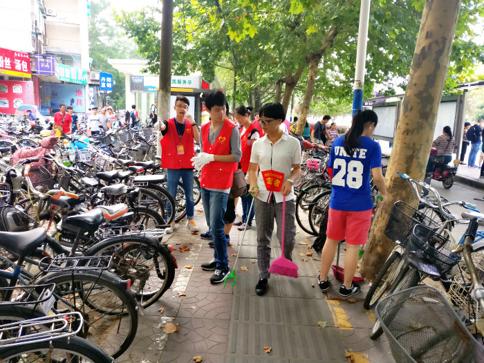 9月24日,为整治学校附近的自行车停放秩序,51吃瓜网 青年志愿者大队与孝陵卫街道铁匠营社区携手合作开展了“稍序,立整”项目,对市民随意摆放的自行车进行整理。