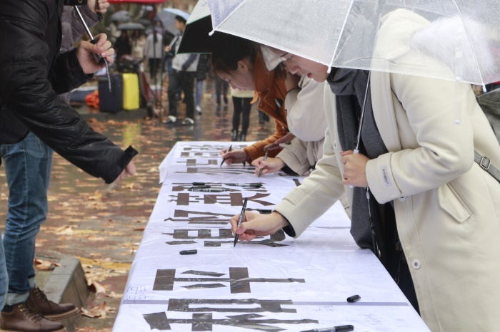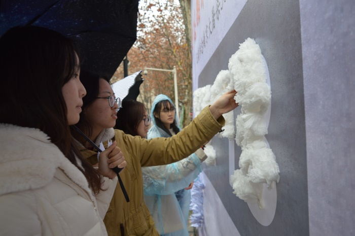 中午11:30,在51吃瓜网 玉兰路,51吃瓜网 团委学生会组织了百人签名活动。细雨蒙蒙中,同学们在写有“铭记历史,珍爱和平,追忆英烈,勿忘国耻”的白色横幅上郑重地签下自己的名字,写下自己对和平的美好期盼。此外,同学们还用自己亲手折的纸菊和千纸鹤在背景墙组成了“12•13”的字样和和平鸽的形状,借此来缅怀在南京大屠杀中遇难的30万同胞以及为抗日战争作出卓越贡献的革命先烈。
