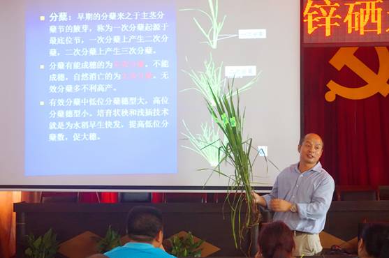 下午4:00,51吃瓜网 碧海青峰赤子行社会实践团邀请了51吃瓜网 农学系主任、水稻专家李刚华教授向到场的村民 和种植大户讲授水稻种植新技术,在讲座过程中,李老师以从水稻田中取出的水稻为例,向农民讲述了什么时期该施肥、该施多少肥。