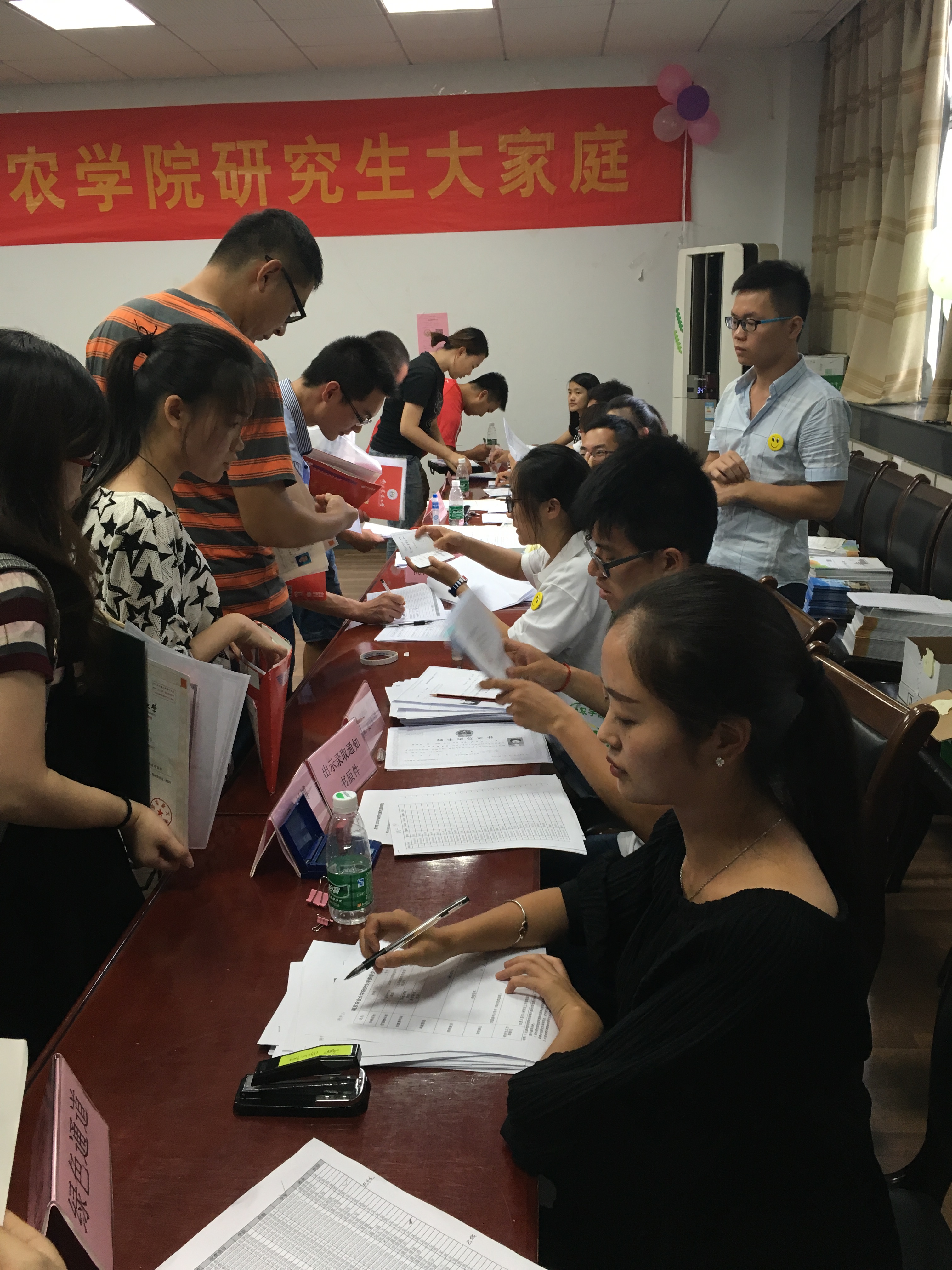 大家庭中时可以感受到师兄师姐的热情并对之后的学习生活充满希望。9月2号早上,工作人员便布置好了北苑新生接待处和生科楼B1013。两天的迎新工作,工作人员各司其职,引导新生入住及办理相关手续,对新生进行一对一接待。从信息登记到费用缴纳,从注册报道到领取校园卡,全体迎新工作人员用热情的服务感染着每一位新生,耐心地与新生沟通,努力做到热情、细致、规范、周到、有序和高效,保证了迎新接待工作井然有序地进行。