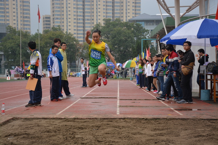 心跳中伴随着激情,微笑中伴随着期盼。谁说女子不如男,鲤鱼跳跃了龙门可以成为龙,而青鸟浴火翔九天也可成凤凰。望着眼前形似龙门一个不足一米五的横杆,健儿们没有什么复杂的思绪,就是为了青春,为了荣誉,为了我们共同的集体,她们将飞跃它。一阵短促而稳健的助跑,接着一个迅猛而轻盈的起跃,伴随着下落,喝彩声四起。然而,阴沉的天空和淅沥的秋雨似乎不愿给健儿们更多的好运,横杆落地伴随着惋惜声四起。但年轻的心却嫣然一笑吐出一份坦然,拍去身上的灰尘,继续为同伴呐喊。在奋斗的青春光环下,她们每个人都是一只成功的小青鸟。