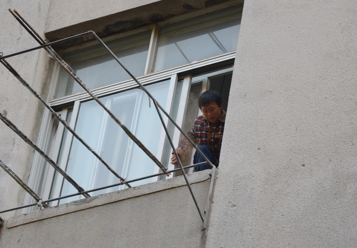 随着前期准备工作的完成,所有参与演习的学生以及工作人员在各自所属的位置上待命,消防车从玉兰路驶向5舍,演习正式拉开了序幕。“火情出现!”5舍416房间的窗户冒出了滚滚浓烟,一名男同学在冒出烟雾的窗口捂住口鼻呼救挣扎试图准备跳楼。这时,火情侦察员拨打了“119”火警电话,并拉响了警报,随后学校保卫处与校医院的工作人员赶到现场。紧接着,几名消防官兵迅速冲下消防车,铺好消防管道,打开消防栓控制周边火情,另外两名消防员从工具箱内取出担架,带领负责救援的同学,换上隔热服,冲进5舍,进行人员搜救。几分钟后,楼门口有大批学生经楼梯跑出宿舍楼,用毛巾捂住口鼻,成功疏散。随后,两名身穿隔热服的消防队员把一位“受伤”的同学用担架抬出,并配合校医院的医护人员进行现场“紧急治疗”。在确保所有人员顺利逃出楼道,伤员抢救完毕之后,消防演习活动成功结束。