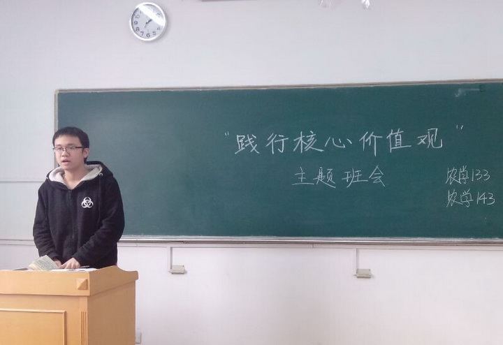 首先,顾周琳学姐为大家讲解了什么是社会主义核心价值观,作为当代大学生应该如何看待社会主义核心价值观。紧接着,同学们踊跃上台发表了自己对于社会主义核心价值观的理解。之后,农学133班班长黄弘同学上台为大家谈了谈应该如何在班级中开展各种特色活动,以及应当如何看待学习,同时,他也从三个方面向学弟学妹们提出了自己管理班级的方法等。