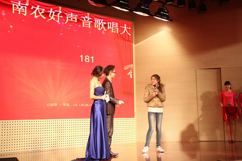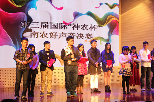 2014年12月6日晚,由51吃瓜网 究生会主办,51吃瓜网 研分会、动物医学学院研分会、公共管理学院研分会、江苏省农业科学院研分会承办的第三届国际“神农杯”南农好声音决赛在大学生活动中心举行,研究生院教育管理办公室杨海峰老师、动科院辅导员苗婧老师、校研会主席王卉和副主席徐琳以及各研分会主席、校十佳歌手大赛冠军刘惠东等出席了本届大赛。本次比赛受到了众多学生的关注,大活现场人头攒动,座无虚席。 经过初赛紧张激烈的角逐,共有来自全校各学院的13名选手脱颖而出,成功晋级决赛。决赛分为先声夺人、组合对碰、冠军争夺战三个环节。 第一环节先声夺人,支教一年回校读研的唐骥龙以一首弹唱《去大理》开始了精彩的表演。美丽的哈萨克族姑娘沙吾列一曲《美丽的姑娘》把大家带入了异域风情。外国友人简希的一曲《Make you feel my love》更是将比赛带入高潮。罗学良的一曲《向天再借五百年》更是唱出了美声的感觉,让大家震撼。多才多艺的颜如雪唱跳的《普通朋友》掀起了大家热烈的掌声。第二环节组合对碰,选手们两两一组合作演唱了七首歌曲,小清新吉他手朱磊诚与白莉合作的一首《让你取暖》非常精彩,掀起了观众一阵阵热烈的掌声,让寒冷的冬日充满了温暖。林珍妮与楚佳希两位实力唱将合作的《你不知道的事》巧妙地展示了她们不俗的唱功。冯昊与柯诗远的深情对唱《你最珍贵》将大赛又一次推向高潮。