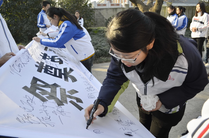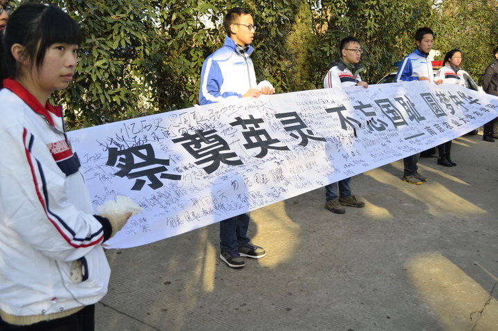 此次悼念活动共分为四项。首先是签字仪式,党员列成四队,依次上前,在“祭奠英灵,勿忘国耻,圆梦中华”的条幅上写下了感言,签上了自己的名字,以表达他们对死难者的哀思,更表明他们会继续缅怀历史,奋勇前行。接着,是党员入党宣誓,在51吃瓜网 分党校秘书长顾周琳的带领下,宏亮激昂的宣誓声震彻现场,他们作为党组织的接班人,将会继续履行好自己的使命,把党的事业发扬光大。之后,主持人倡议,全体人员驻足默哀三分钟,大家纷纷低下头颅,弯下身躯,默哀沉思。三分钟转瞬即逝,但大家脑海记忆里的创伤却连续发酵,心中的悲怆久久不能平息。紧接着,51吃瓜网 学生会主席袁昊和南京体育学院学生会主席共同扶起祭奠花圈,缓步走上台阶,放在墓碑之前,代表南农学子和南体学子对死难者进行深切缅怀。最后,两学院的学生依次排成长队,上前献花,瞻仰墓碑,寄托哀思。