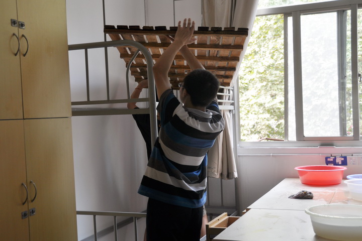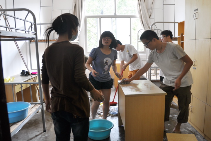 下午1点半,大二同学从各自的宿舍拿来笤帚、抹布等工具,准时到达他们负责的二十舍和五舍,开始进行卫生大扫除。在学生会的指导下,他们对柜子、抽屉里的杂物进行了清理,门窗、地面也都用水清洗得干干净净。