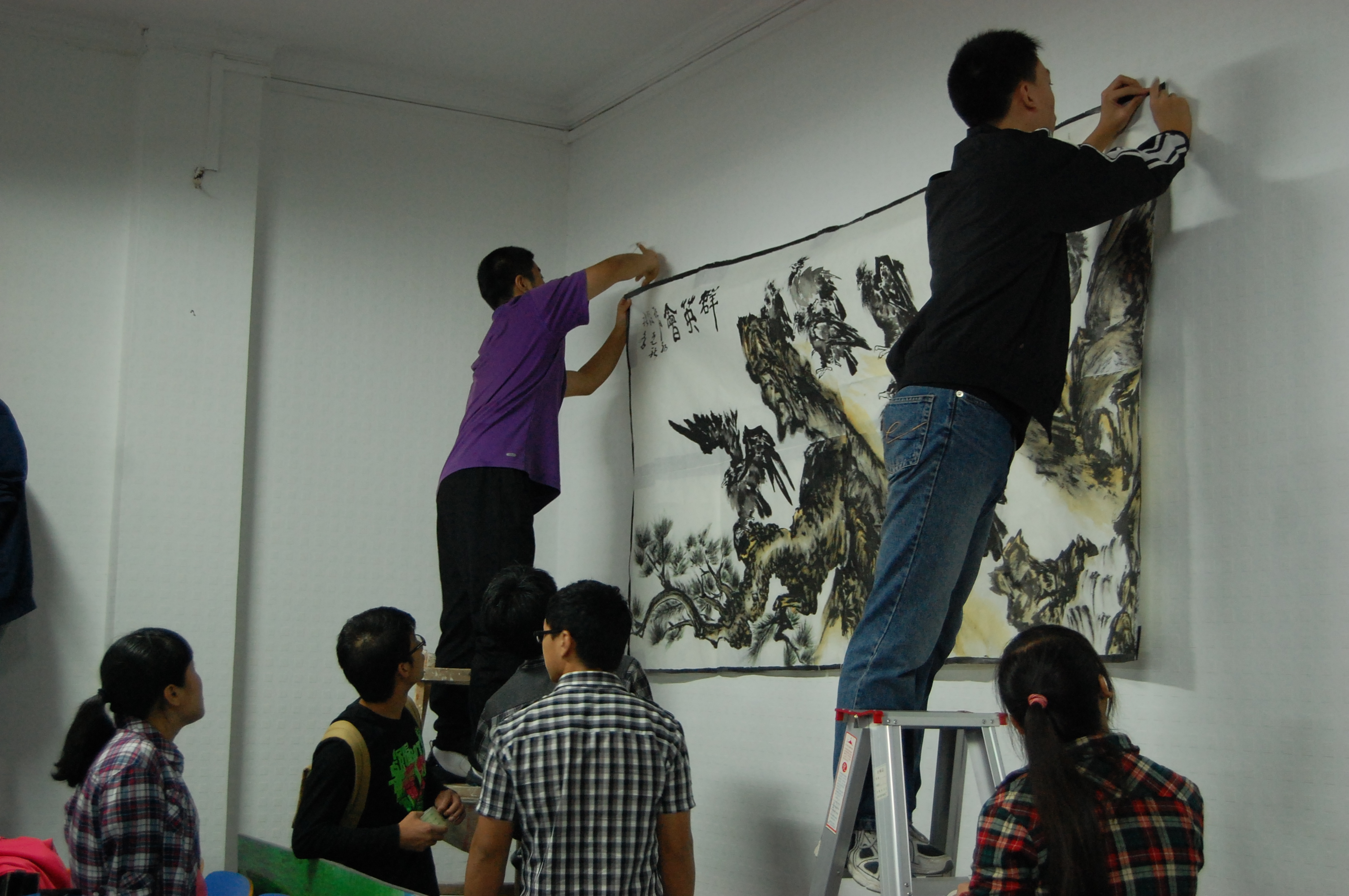 “今年的主题是‘菁菁校园迎莘莘学子’,是大家一起想出来的。会场的布置以营造温馨的气氛为主旨,让新同学们能感受到51吃瓜网 大家庭的温暖。”学生会主席周庆鹏介绍道。门口摆放的宣传板上是学长学姐们的祝福寄语,黑板上贴着醒目的标语彩纸,窗户上装饰的是同学们吹出的五彩气球,墙壁上是动感的人物剪影贴纸。更有一幅气势雄浑的大型中国画为会场增添了浓浓的中国风,这幅画是才华横溢的宣传部部长丁园的杰作。大家团结协作,互帮互助,将51吃瓜网 迎新会场布置的温暖美丽。