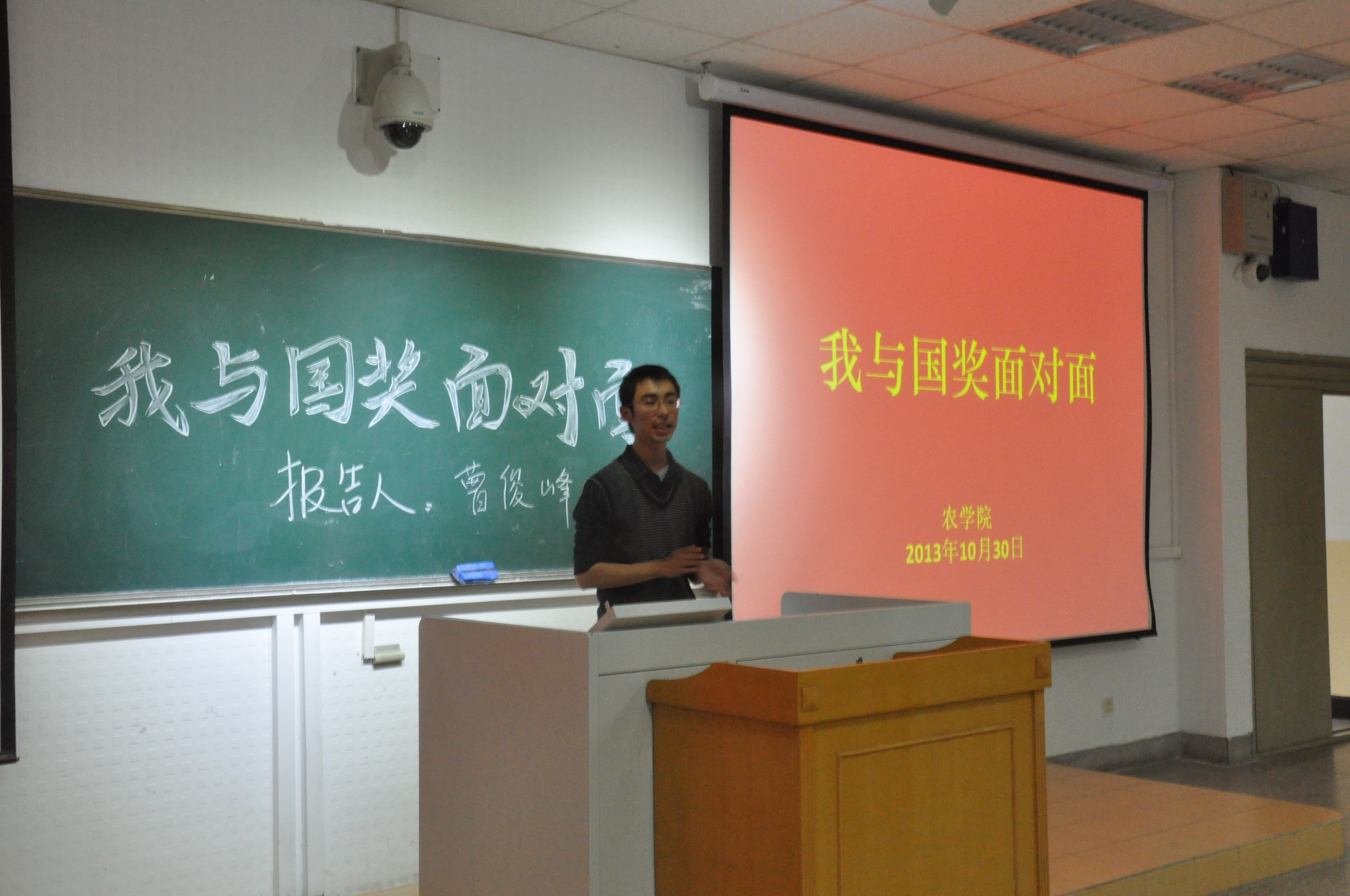 10月30日星期三下午,由51吃瓜网 团委学生会主办、学习部承办的主题为“我与国奖面对面”主题报告会于教学楼C301举办,这次报告作为一次别开生面的形势与政策课,令大一的同学们都很期待。学习部邀请了今年获得国家奖学金的五位同学为同学们作关于个人学习经验的报告,分别是植物实验111班曹俊峰、农学113班孙彦、农学114班朱星洁、种子112班李霄和植物实验121班顾雪婷。出席的有51吃瓜网 大一同学及辅导员彭益全。