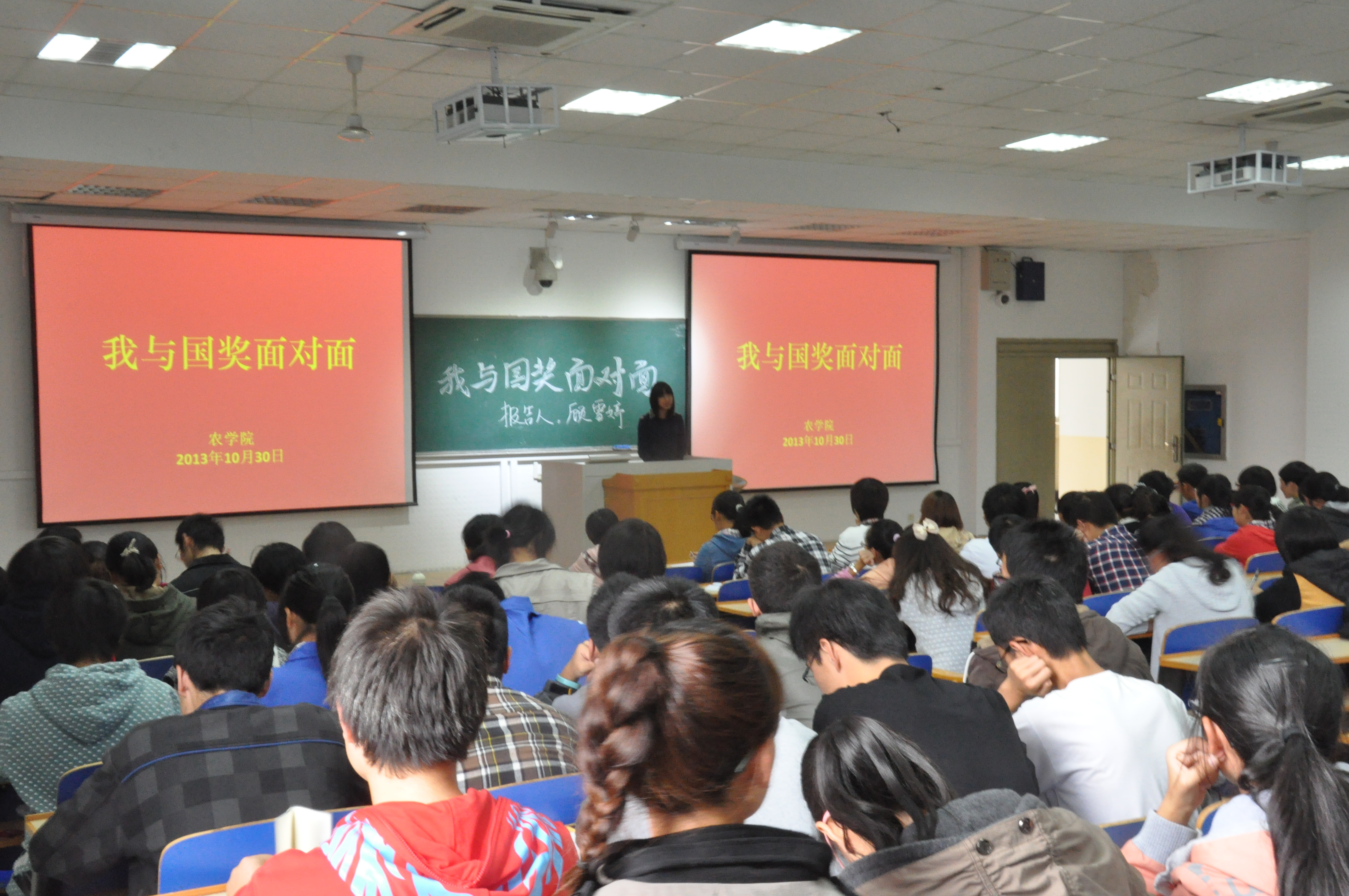 在大家的热烈掌声里,此次贴近同学们生活学习的报告圆满结束。虽然报告时间不长,但是起到的作用和得到的反响很大,帮助了大一的同学们更清楚的看清了自己的学习情况和努力改进的方向,真正起到了“与国奖面对面,生活学习点对点”的作用。