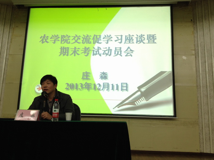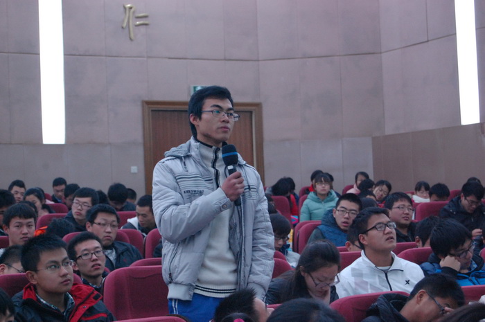 下午二点,动员会正式开始。首先,彭益全老师做了开场白,说明了开展此次活动的背景和目的,并要求同学们认真听讲,积极提问。接下来庄森就大学的学习、生活及接下来要进行的期末考试和同学们交谈,并鼓励同学们考研保研、出国等更进一步的深造,座谈会进行中庄森时时不忘和同学们互动,并对他们提出的问题进行详尽的解答,使会议达到了高潮。