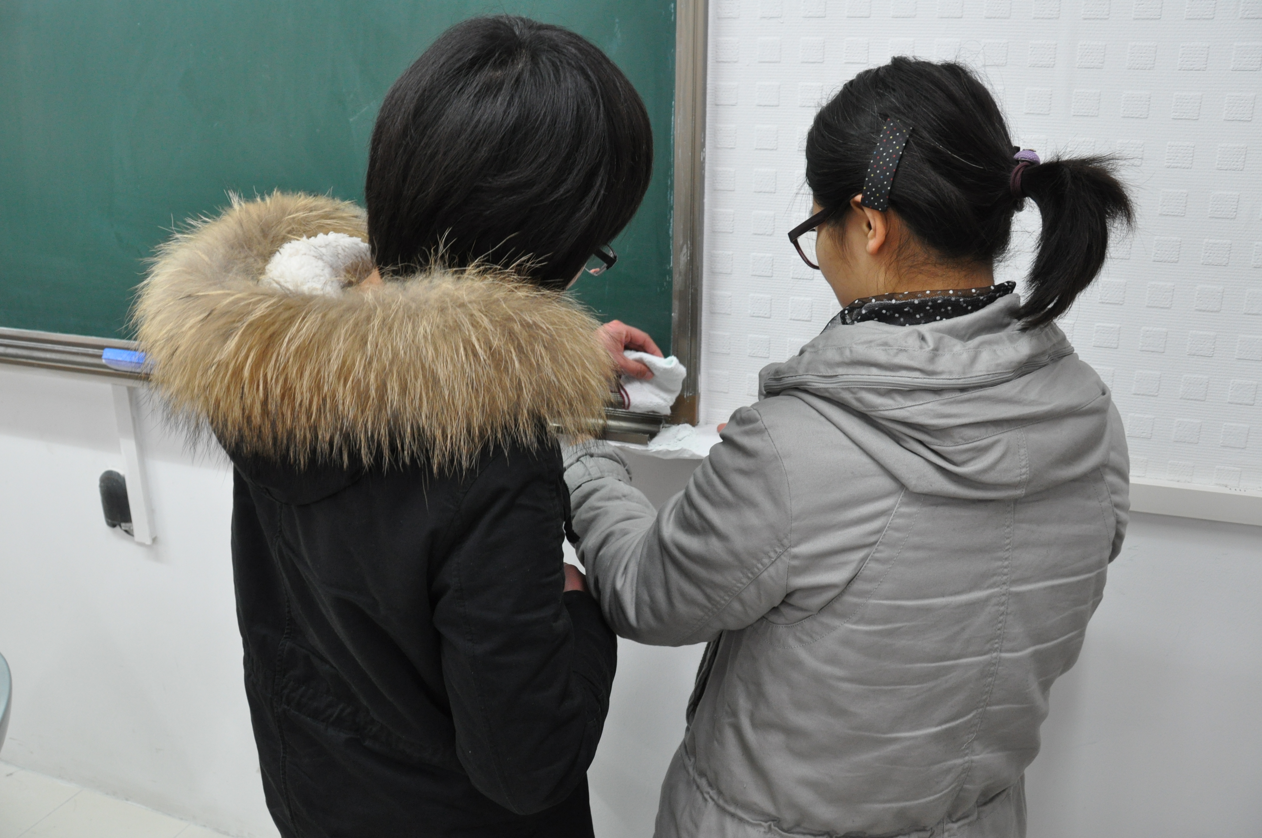 通过精心的策划、分工后,同学们带着服务他人的激情走向教室。从二楼到五楼,两人一组,一人先用黑板擦将字迹擦净,然后另一人再用湿毛巾将其擦洗一遍,大家的动作熟练,乐此不疲。在彼此的帮助下,同学们用勤劳的双手擦亮了一面面黑板,同时也擦亮了一面面传授知识的墙,扫净了一座座知识传递的桥梁。